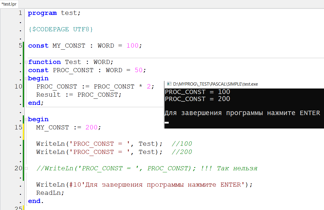 Далеко не во всех языках программирования имеется такая вещь, как типизированные константы. Но в Delphi и Lazarus это есть. Объявляются они так: const ИМЯ_КОНСТАНТЫ : ТИП_ДАННЫХ = ЗНАЧЕНИЕ; В большинстве случаев тип не указывается, поскольку с константами обычно в этом нет необходимости. Но если вам почему-то надо, чтобы константа имела конкретный тип данных, то это можно использовать. Но главная фишка типизированных констант в Lazarus (но не в Delphi) - это возможность изменять их значения в программе. Кроме того, их можно использовать как статические локальные переменные в подпрограммах. При этом из основной программы они не видны, но сохраняют свои значения после завершения работы подпрограммы (то есть не уничтожаются после завершения работы процедуры или функции). Пример: Напомню на всякий случай, что локальная типизированная константа не видна из основной программы. То есть её нельзя там использовать непосредственно. Но, в отличие от локальных переменных, она сохраняется в памяти