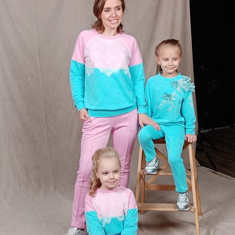 Раз статья об индивидуальном заказе вызвала интерес и на неё даже пошли подписки, причём достаточно большое количество, то буду писать подробнее о нём. Вчера была первая примерка) Учитывая тот момент, что я не шила на заказ взрослую одежду 4 года приблизительно, то естественно я волновалась) Причём конкретно так, так как ещё же и размер 64) Вот чтобы быть честной и точной, то последний раз я шила на заказ для взрослых почти 2 года назад, но работа была совсем другая. У меня заказали комплект по моим уже готовым работам: Это я в качестве модели и мои юные модели) Кстати, это фото любительские и они мне больше всего нравятся, вот не знаю почему) Свой костюм я уже просто заносила, скажу вам честно) Один из самых любимых получился) И у меня заказали два свитшота и под них брюки , юбку и шорты. В итоге я делала вот так: И вот так: К бирюзе добавили белый цвет, это было пожелание клиентки) Кружево я поставила другое так как это по качеству лучше. Дело в том, что стирать приход