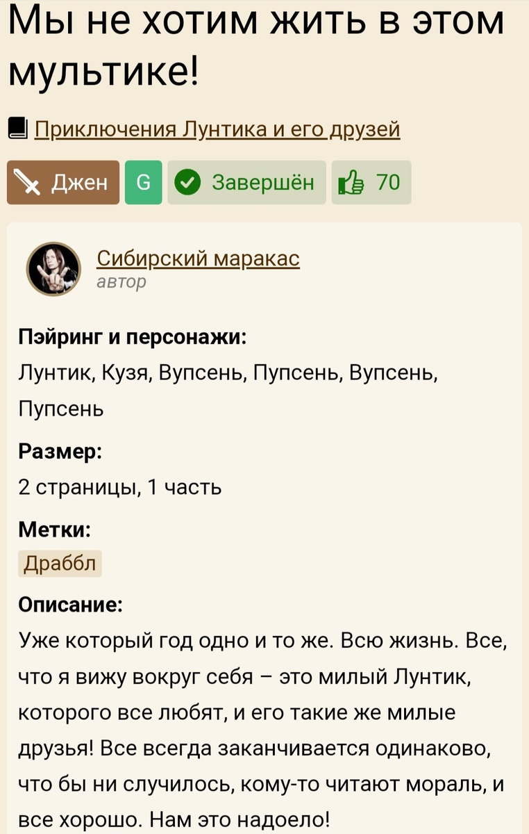 Здравствуйте, уважаемые читатели. Сегодня речь пойдёт о качественном фанфике по Лунтику, вышедшем аж в 2014 году. Этот фанфик вышел 10 лет назад, однако я ознакомилась с ним лишь в конце прошлого года. И, к слову, он произвёл на меня достаточно большое впечатление. Моя сегодняшняя рецензия посвящена фанфику под названием "Мы не хотим жить в этом мультике!", автором которого является "Сибирский маракас". 1. Описание. Фанфик "Мы не хотим дить в этом мультике!" состоит из одной главы объёмом в 2 страницы. Описание работы на Фикбуке: Уже который год одно и то же. Всю жизнь. Все, что я вижу вокруг себя – это милый Лунтик, которого все любят, и его такие же милые друзья! Все всегда заканчивается одинаково, что бы ни случилось, кому-то читают мораль, и все хорошо. Нам это надоело! 2. Сюжет. В начале сюжет данной работы очень похож на сюжет типичной серии мультсериала "Приключения Лунтика и его друзей". Лунтик, Кузя и Мила, вместе с Корнеем Корнеевичем, построили большую горку, чтобы катать