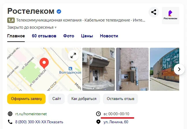 В ноябре 2022 года, как только мне провели интернет, у меня вдруг изменился номер лицевого счёта (в договоре и прочих сопутствующих документах прописан один, а потом – оп! – сделался другой). Собрался я сгонять в контору, спросил у «Яндекса» режим работы, а он попросту фантастический, прилагаю скрин: