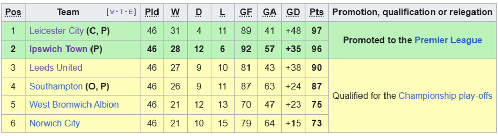 Турнирная таблица верхней части Чемпионшипа-2023/24 96 очков (рекорд для команды, только вышедшей из Лиги 1, и 11-й результат в истории Шипа, в принципе) 92 забитых мяча (больше всех в лиге) Тренер команды Киран Маккенна признан тренером года в Чемпионшипе Гол Уэса Бернса признан лучшим голом сезона