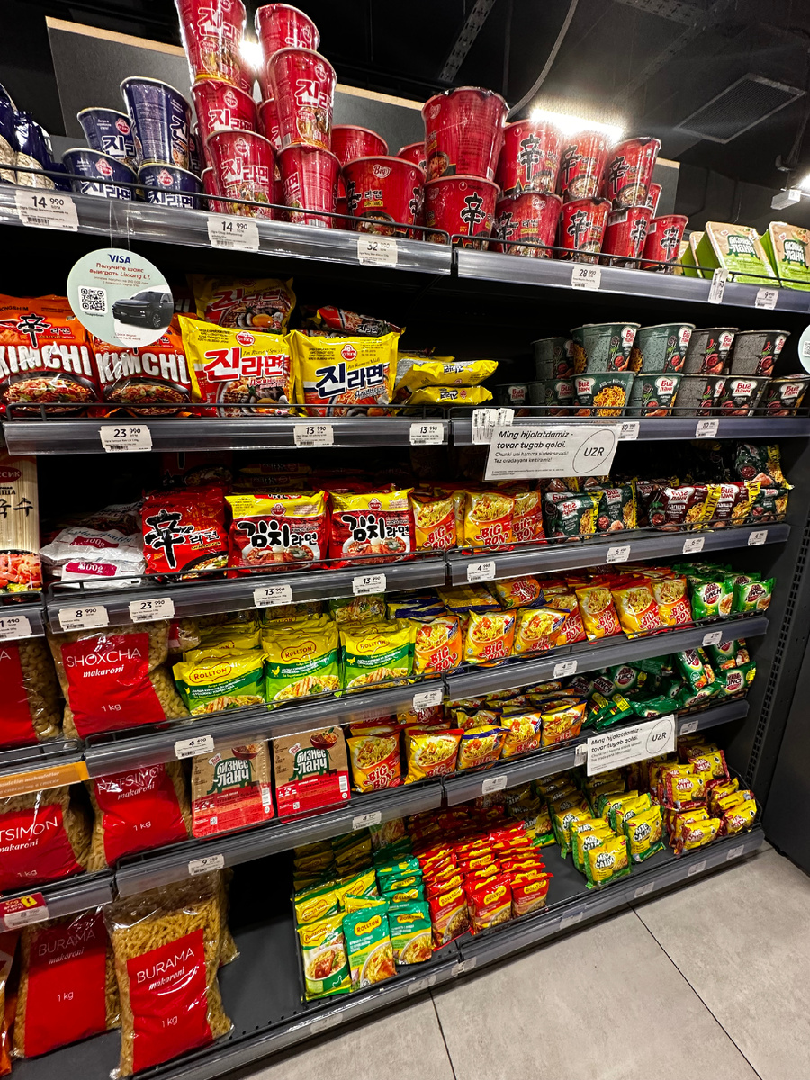 Возможно кому-то будет интересно сравнить ассортимент с такими магазинами, как Магнит или Пятерочка в России. А так же сравнить ценники с ценами на базарах Ташкента или в других странах.