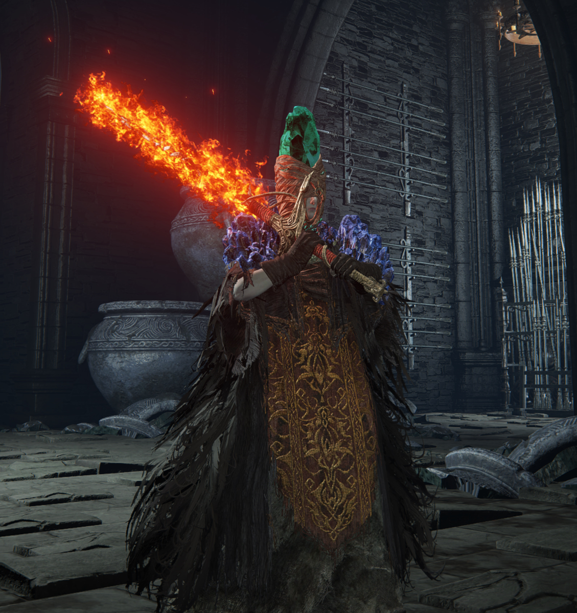 Двуручник Огненного рыцаря вместе с пеплом Полыхающего ветра смотрятся так, будто Погасший – протагонист аниме. В этом гайде Кибер расскажет, как найти это оружие, пепел для него и лучший талисман для всех, кто играет двуручными мечами. Характеристики: Двуручник Огненного рыцаря Все начнется с точки телепортации Главные ворота Пристанища теней, либо благодати за ней, если вы уже убили золотого гиппопотама. Нужно пройти в дверь слева и идти наверх к комнате с лучником и рыцарем с молотом. Наверху нужно пройти в левую дверь. Снаружи нужно пробежать мимо гномов с серпами до большой лестницы. По ней ходит Огненный рыцарь с необходимым нам оружием. Для повышения шансов выпадения двуручника воспользуйтесь талисманом Серебряного скарабея или маринованной птичьей лапкой из основной игры. После убийства рыцаря пробегите немного вперед, поднимитесь на лифте и активируйте там благодать. Отдохните, чтобы мир обновился, и можно снова приступать к фарму. Вероятно, меч выпадет не с первого раза – как