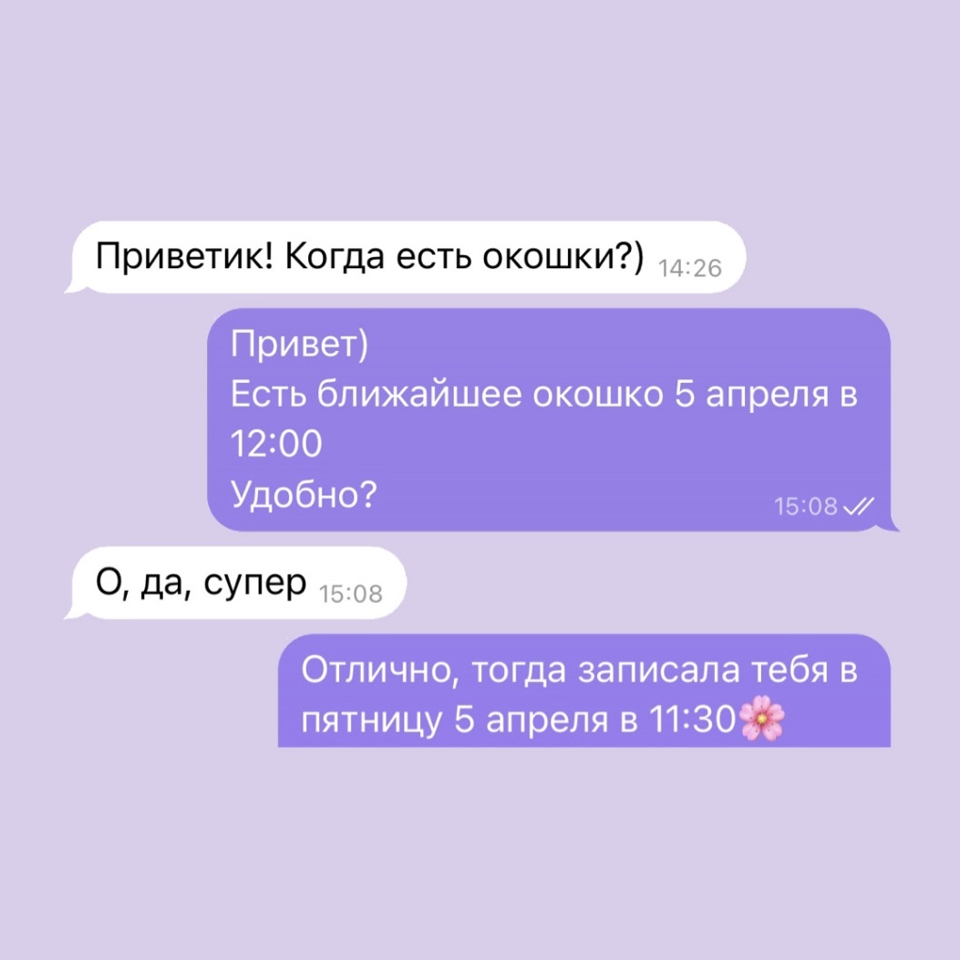 1. Важно проявить заботу о клиенте ещё с самого первого его сообщения. Предложите ему свободные окошки для записи. Никогда не отвечайте на вопрос «Можно записаться?» фразой «Да, можно». Всегда задавайте вопрос в конце сообщения, иначе клиент от Вас уйдёт ещё на первом этапе. 2. Если он записался, отправьте ему подробный адрес, как до Вас добраться. А ещё лучше видеоинструкцию, так клиент точно не потеряется и дорога для него будет комфортной. 3. За день до записи не забудьте отправить напоминание о предстоящем визите. Многие могут просто случайно забыть или перепутать время. И клиенту напомните, и себя обезопасите от того, что он не пришёл. 4. Через неделю-две после визита, особенно у новых клиентов, поинтересуйтесь, как держится покрытие. Все ли хорошо, нет ли сколов и отслое