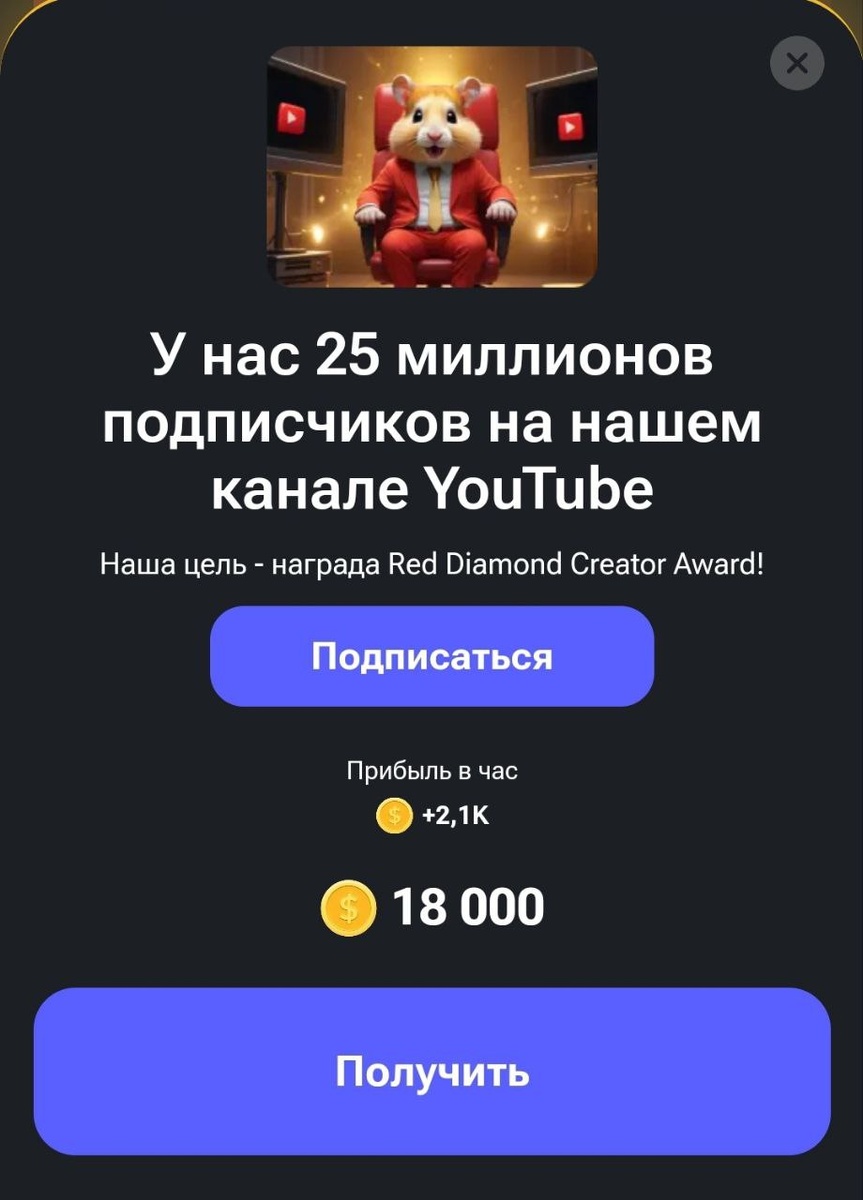 Hamster Kombat новая карточка YouTube 25 Million
