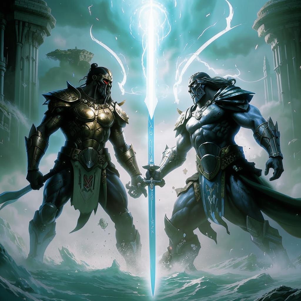 И вот два гиганта сошлись в яростной схватке. Их мечи высекали искры, сталкиваясь друг с другом. Доспехи проминались от пропущенных ударов – настолько велика была сила воинов. От разгоряченных тел шёл пар. Кружась в смертоносном танце, двое потомков атлантов сметали всё вокруг себя: стены, колонны и даже сталактиты, усеивавшие пещеру тут и там. Но ни один из них не мог победить другого. Уже в который раз. Удар, за ним новый, ещё и ещё, но всё тщетно – оба соперника невредимы. Лишь прибавилась пара вмятин на искусно сделанных доспехах. И не было ни в чём разницы между ними – ни в мастерстве владения мечом, ни в силе, ни в скорости.