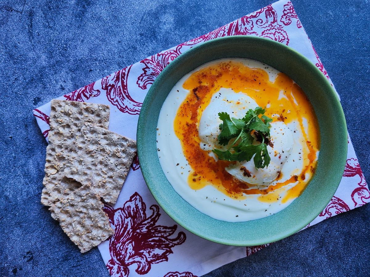 4. Как только яйца готовы, собираю блюдо. Выкладываю яйца пашот поверх йогурта, поливаю красивым и ароматным растопленным маслом и украшаю кинзой. Ем с хлебцем или ломтиком бездрожжевого зернового хлеба из Каравай СВ.