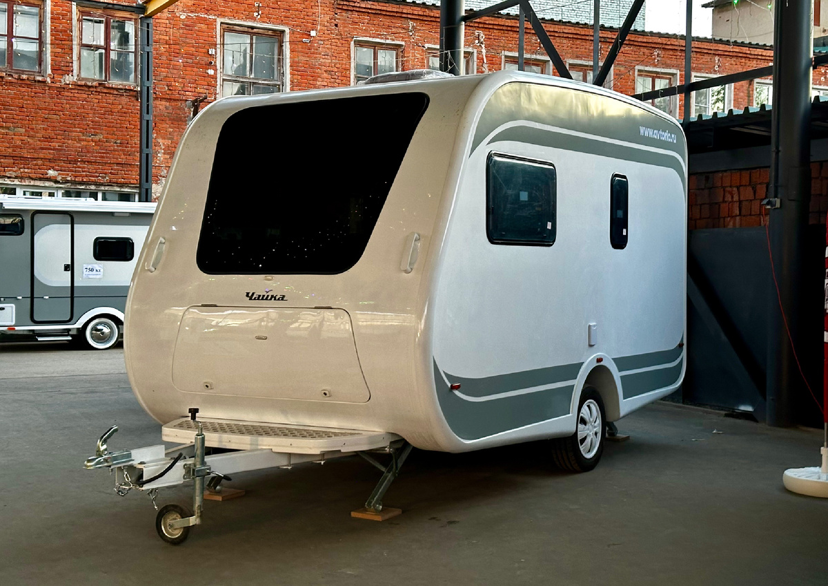На выставке «Караванекс» впервые представили прицеп, построенный по технологии монокок. Литой кузов из стеклопластика исключает попадание влаги и образование мостиков холода. Форма кузова напоминает знакомые европейские аналоги, однако прицеп получился намного интереснее и продуманней. Давайте разбираться. * Буксировка прицепа разрешена с правами категории В. «Чайка» имеет красивую закругленную форму. Крепкий корпус отлит из стеклопластика. В основе - каркас из стеклопластиковых трубок, внутри стен утеплитель - пенополистирол. Спереди большое панорамное окно. В корпус «Чайки» встроен рундук для транспортировки газового баллона, канистры для топлива, инструмента. Для удобства крышка фиксируется в верхнем положении С платформы на дышле проще дотянуться до окна, чтобы протереть стекло от пыли. Сюда можно закрепить груз. Сзади установлен американский квадрат для крепления велосипедной стойки. На передней и задней стенке 4 ручки для выравнивания прицепа на стоянке. Для «Чайки» выбрали класс