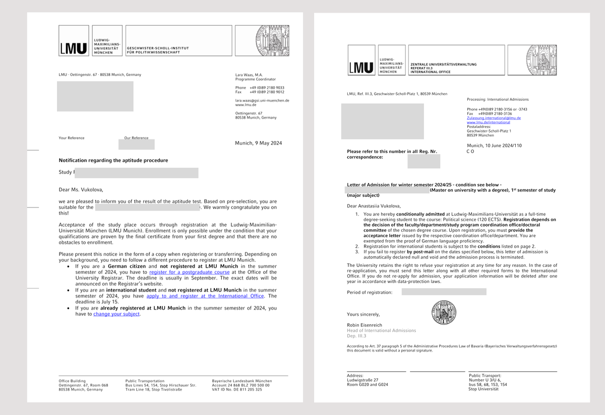 - Желательно, чтобы на руках было 2 приглашения. В LMU по крайней мере 1 приглашение – от координатора курса, а 2-е из International Office, который приходит после того как ты отправил в универ документы – это полный допуск, где говорится, что тебе дают место на курсе.