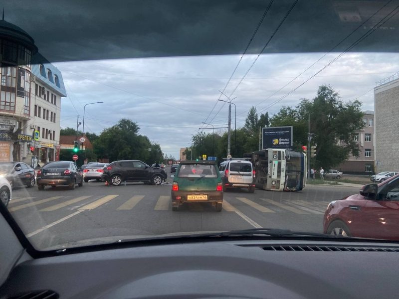 По словам очевидцев, вечером 22 июня на перекрестке в центре Оренбурга столкнулись Nissan и автобус ПАЗ. Удар был такой силы, что пассажирский транспорт опрокинулся и упал на бок.