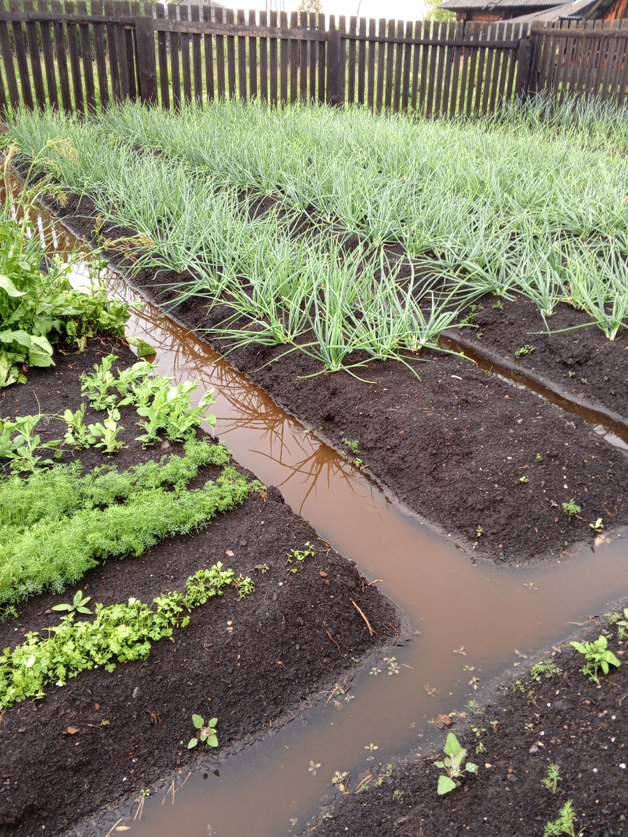 Здесь видно место повыше,почти в междурядьях нет воды зато там хоть на лодке катайся,но сейчас уже почти вся вода впиталась.Хорошо хоть что грядки всегда муж делает высокие,я его так прошу.Не люблю низкие грядки с молодости.
