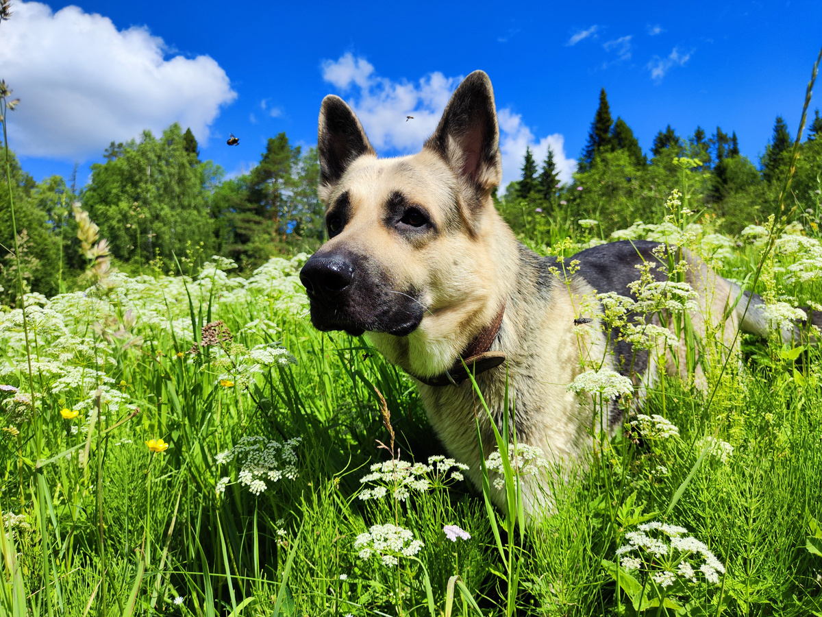 Ну, как? Милашка Дарик? Такая прелесть - собачка в цветочках! Но на самом деле Дарик не балдеет и не наслаждается природой. Это он следит за кусачим слепнем, к нему подбирающимся. Видите, у него перед мордой висит? А приглядитесь-ка, он там есть