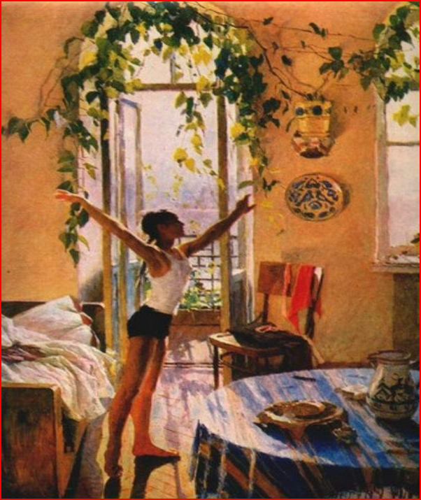 Картина Т. Яблонской «Утро» написана в 1954 году. Прошло 9 лет после Великой Отечественной войны… Советские люди уже могли спокойно вставать утром и идти на работу, в школу. Именно такую счастливую атмосферу запечатлела Татьяна Яблонская на картине. Девочка в городской квартире делает утреннюю гимнастику. Комната, в которой находится юная особа, с высоким потолком. На стене висит скромное панно, свешивается длинная зелень. Стол покрыт светло-синей скатертью. На стуле лежит школьная форма и висит пионерский галстук. Двери балкона, на котором видны растения, открыты, и солнечный свет и свежий воздух проникают в комнату. Это уже поздняя весна, когда погода с утра теплая и солнечная. Девочка в белой майке и черных шортиках. Она плавно поднимает руки, при этом отодвигая правую ногу назад. Девочка находится в таком состоянии, как будто тренируется будущая балерина. От неторопливого размаха рук и в целом от фигурки девочки создается впечатление полета: «вот так бы взяла и полетела!». Художниц