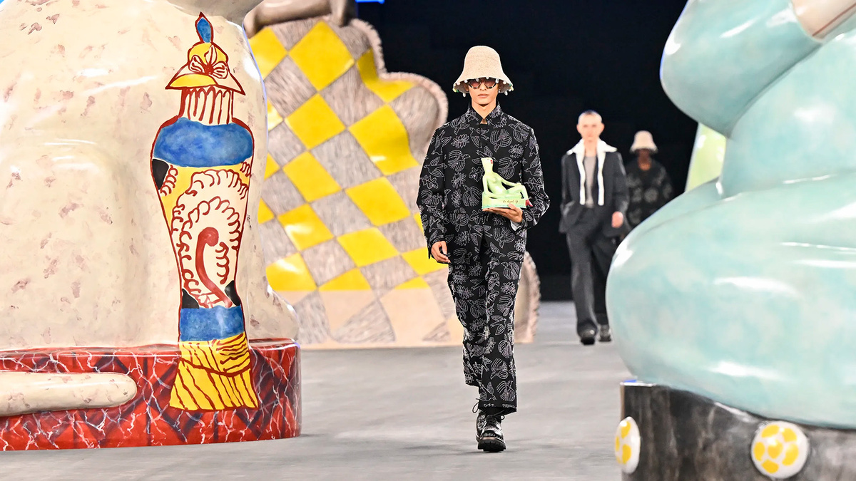 Любители пушистых и усатых, вы здесь? Пять гигантских кошек на подиуме Dior, которые сопровождали всех моделей, были созданы по мотивам работ керамиста Хилтона Нела. «Он мой старый друг. Мне нравятся его работы, и я хотел использовать эту идею сотрудничества с художником и работы с архивами Dior», — сказал Ким Джонс. Dior Men весна-лето 2025 Шипованные контуры на ботинках, верхней одежде и костюмах, а также значки, трикотаж и носки были созданы в сотрудничестве с Нелом. Животные, выполненные южноафриканским художником, нашли своё отражение даже на носках ярких цветов. А крупные керамические бусины окаймляли тканые шляпы, созданные южноафриканскими мастерами и дизайнером Стивеном Джонсом. Эти искусные штрихи были сплетались с коллекцией, безупречный современный пошив которой выразился в тканях: силуэты были просто изумительными и очень скульптурными. Даже рабочая одежда — например куртки с поясом, куртки с карманами на заклёпках и прекрасные модели из льняного хлопка — отличалась блестя