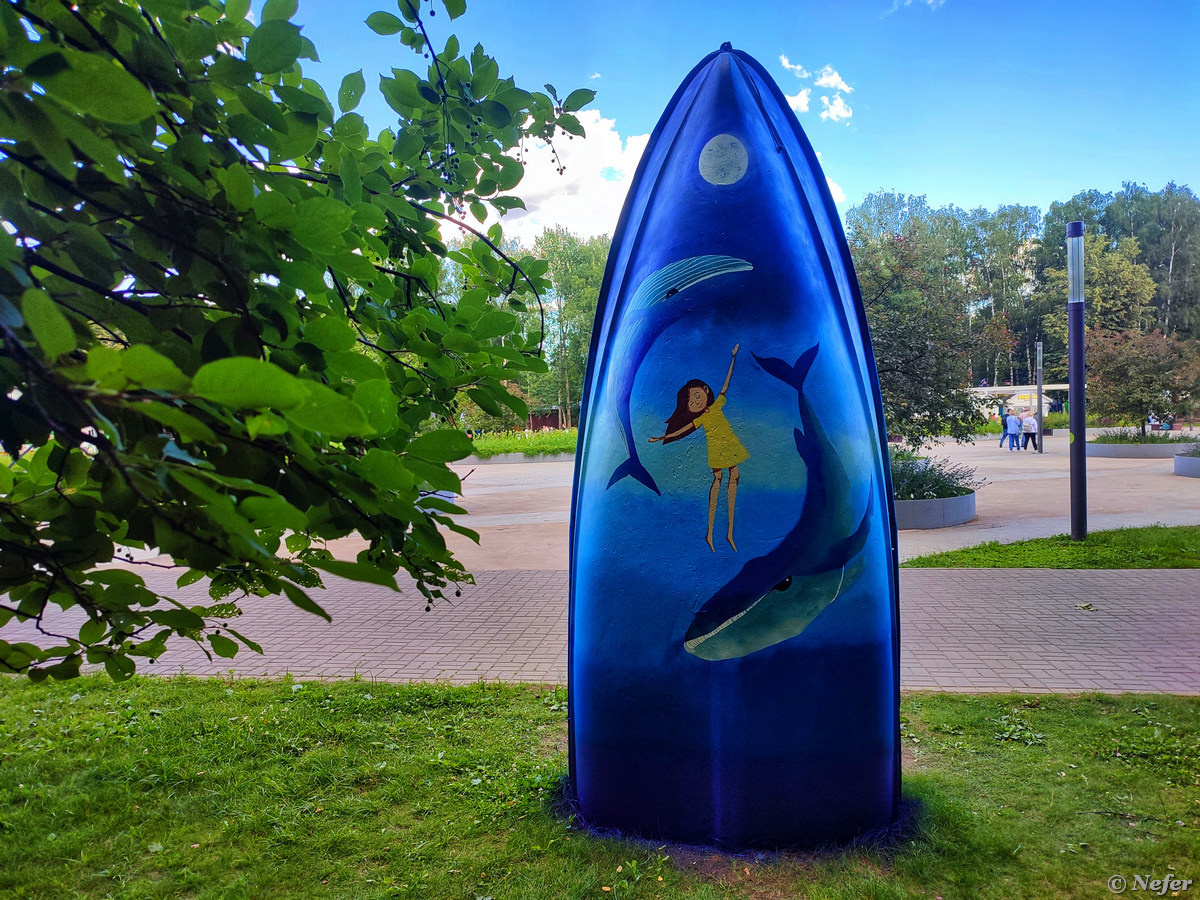 Две чудесные лодки. Одна по мотивам русских сказок, такая яркая и запоминающаяся, вторая - серьезная и концептуальная. Это уже по пути к пруду.