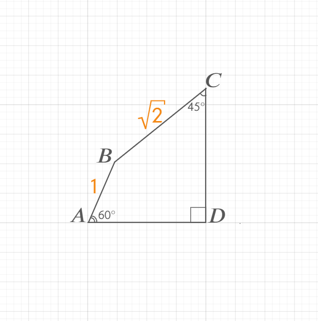 9. ★☆☆ В четырёхугольнике ABCD углы при вершинах A и C соответственно равны 60гр и 45гр, а угол при вершине D прямой. Найдите его сторону AD, если AB=1, BC=кореньиз2