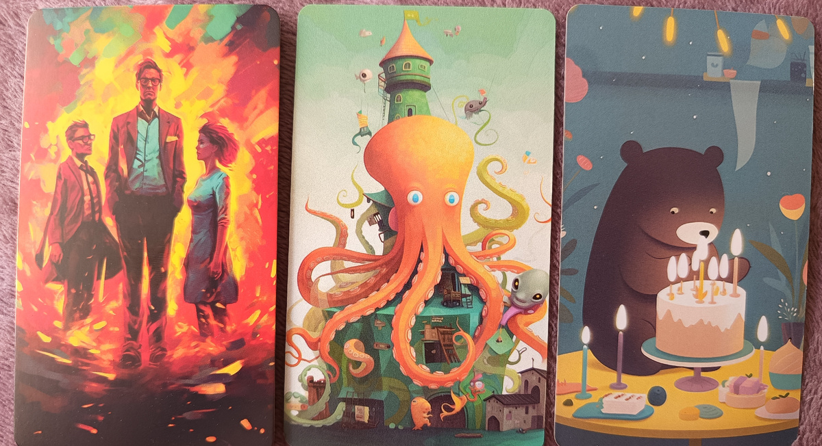Наследие... На первой карте человек, а сзади у него стоят его родители. На второй осьминог, который своими щупальцами окутывает весь дом. На третьей карте медведь празднует день рождения... Три карты сложились в историю о том, что очень большое влияние на нас оказывает то, где мы родились: кто наши родители, какие установки/программы запустили свои щупальцы в нашем роду... И всё это на семь покалений (судя по количеству свечей на торте)...