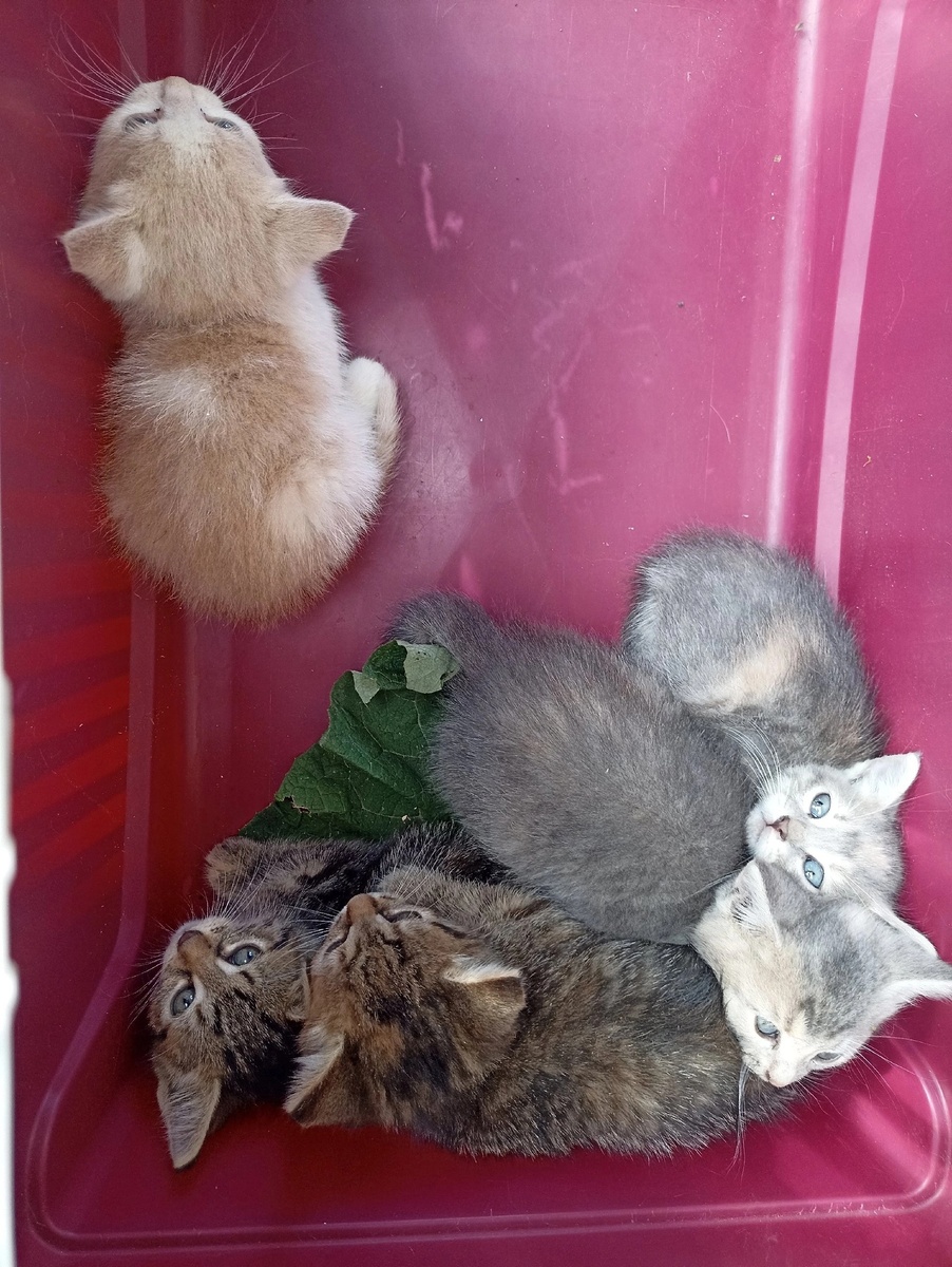 В итоге поймано 5 котят, возраст около 5-6 недель... Выбросили их у помойки у школы (ну самое место для помойки!). Спасибо Галине и её мужу, они их покормили, сами поймать не смогли, но сообщили, пожалели мелких. У самих четверо.