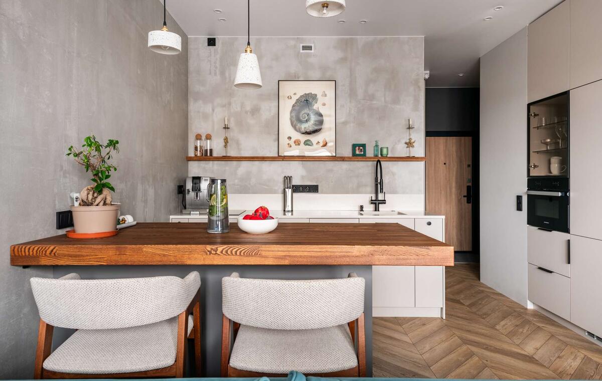 Дизайнеры поделились секретами экономии без ущерба функциональности и стилю Место: Москва Метраж: 49 кв. м Год реализации: 2024 Комнаты: 2 Cанузлы: 1 Высота потолков: 2,8 м Дизайн: Buro brainstorm Фото: Глеб Хлопунов Эта двухкомнатная квартира 49 кв. м находится в новом ЖК «Лайф Варшавская». Заказчик — молодой мужчина с питомцем, джек-рассел-терьером. Перед дизайнерами из Buro Brainstorm он поставил задачу — разместить на скромном метраже спальню, кухню-гостиную с барной стойкой и диванчиком, гардероб и санузел с душевой кабиной. В процессе разработки проекта родился концепт квартиры «Море», к нему уже дизайнеры выбирали цвета, материалы и декор. Прихожую не стали отделять от жилого помещения дверью — так она выглядит просторнее и объемнее. Кухня расположена на месте, которое определил застройщик, ближе к окну организовали зону гостиной. Спальня приватная, отделяется от кухни-гостиной перегородкой в лофтовом стиле. Хранение организовали в гардеробной, чтобы не загружать интерьер. Кухн