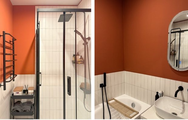 Продумали функционал в небольшом помещении, предусмотрев и душевую, и ванну Планировку и дизайн этой двухкомнатной квартиры СММ-менеджер Настя Семенова продумала сама. Для оформления жилых помещений она выбрала белый цвет. Раздельный санузел выделила цветом, окрасив часть стен в насыщенный терракот. На полу — шестигранная мелкоформатная плитка, стены в мокрой зоне облицованы стандартной белой плиткой с контрастной затиркой. Остальные стены окрашены водостойкой краской в яркий терракотовый оттенок — он наполняет помещение глубиной и объемом. У Насти есть маленький ребенок, поэтому для его купания предусмотрели ванну. Также удалось разместить душевую кабину с различными режимами душа. Сантехнику в зоне раковины и ванны сделали встроенной. Скрытые в стенах конструктивные элементы не занимают много пространства и не мешают проводить гигиенические процедуры. Хранение в ванной комнате организовано в тумбе под раковиной, на полочках в душе и в мобильном черном стеллаже. Функциональное решение