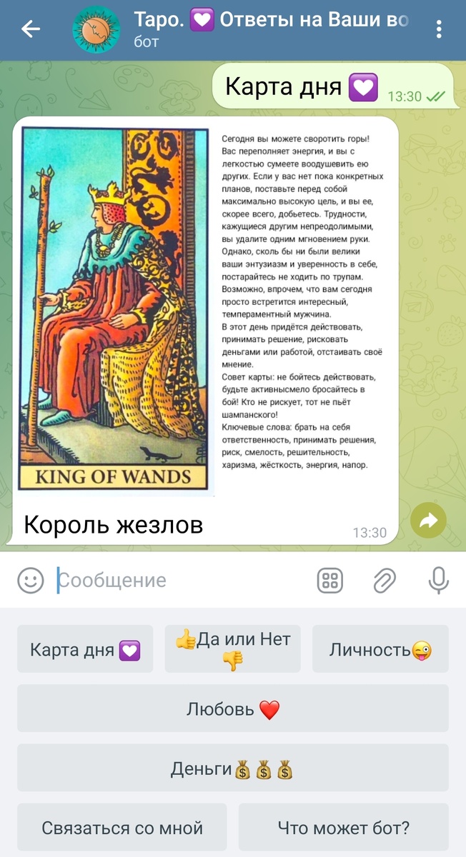 Друзья! Добрый день! Хочу рассказать вам про бота. Я его упоминаю почти в каждой записи, и вы можете всегда в него попасть, задать свой вопрос, и карт не нужно. Как пользоваться? Начну с самого простого. КАРТА ДНЯ. 🌞Спрашиваем у карт - что сегодня меня ждёт? Каков будет мой день? 🌞Нажимаем на кнопку КАРТА ДНЯ. 🌞 Внимательно рассматриваем открывшуюся карту. Анализируем свои ассоциации и отклики, а потом читаем описание. 🌓 Вечером можно зайти в бот и сравнить с тем, что выпало и что произошло за день. Жду Ваши 👍 и 🔥 💟 👉 Таро - Бот 🌓 Таро Луна Нумерология
