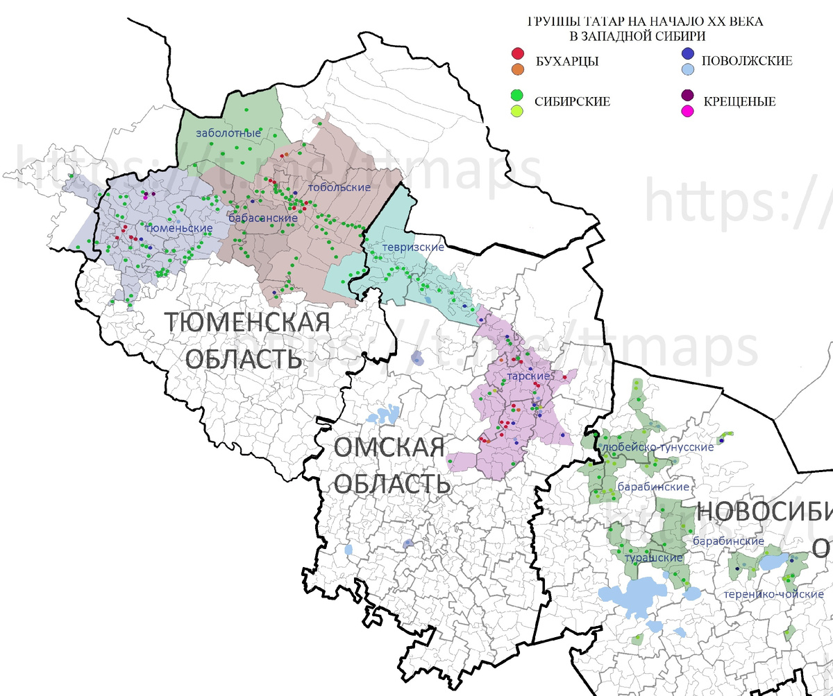 Красным цветом выделены НП с преобладанием бухарцев, зеленым - сибирских, синим - поволжских, сиреневым - крещеных татар на конец XIX века (более светлыми тонами - ныне исчезнувшие НП). Стоит учесть, что уже к концу XIX века практически во всех НП татар проживали как сибирские, так поволжские и бухарские татары в разных долях, за исключением заболотныхх годазх и бабасанских сел, где проживали только сибирцы. А в начале XX (и до 1930-х годов) поток переселенцев из Поволжья усилился. Самое западное село - это Юрты, где проживают потомки манси-мусульман, а заболотные татары - в большинстве своем потомки осевших местных угров (хантов и манси).