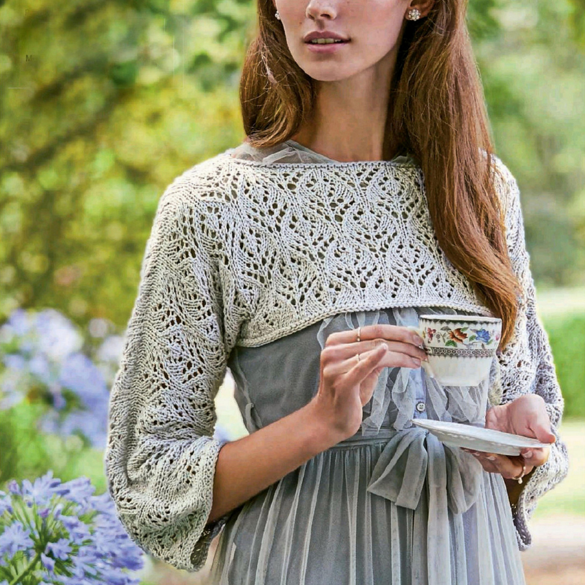 Серый пуловер-шраг с красивым ажурным узором. Мини-пуловер полностью связан ажурным узором и создан скорее для украшения, чем для того, чтобы согревать в холодную погоду. Он прикрывает только руки и декольте, поэтому идеален в сочетании с платьями без рукавов, для особых поводов и посещения храмов.