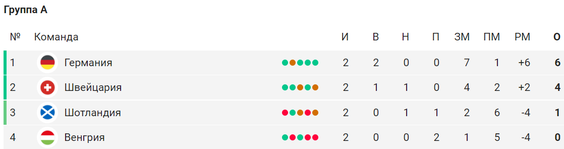 Германия Обеспечила себе плей-офф. Чтобы остаться на первом месте достаточно ничьей со Швейцарией. Швейцария 4 очка практически гарантия плей-офф в данном случае. Чтобы выйти на первое место надо побеждать Германию. Ничья второе место. Проигрыш может отправить команду на третье место, если Шотландия обыграет Венгрию и отыграет 6 мячей разницы. Например, Швейцария проигрывает 0:3, а Шотландия выигрывает 3:0. Шотландия Ничья и поражение оставляет команду за рамками плей-офф. Даже с третьего места с 2 очками попасть в четверку лучших команд с третьих мест не получится. Победа дает шанс на второе место, если Швейцария проиграет Германии и удастся отыграть 6 мячей разницы. Но даже оставшись на третьем месте с 4 очками Шотландия имеет хороший шанс оказаться среди 16 сильнейших Венгрия Венгрии чтобы иметь шанс на плей-офф надо побеждать как можно крупнее. Победа даст 3 очка и 3 место, но текущая разница -4 и при сравнении с другими командами с третьих мест отрицательная разница будет тянуть