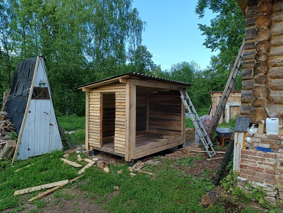 Здравствуйте, дорогие читатели «Вятского Хутора»! Сейчас, пока за окном серо и мокро, пока льёт дождь, можно усесться перед монитором компьютера, чтобы рассказать Вам о продолжении строительства дома для Норда. Если кто не знает, это щенок карело-финской лайки, который не так давно у нас появился. Он получил все прививки и препарат от клещей. Уже выходит на улицу, где изучает двор и продолжает бегать с котом. В прошлой статье про жильё для собаки я остановился на кровле и двери. Тогда закончилась резиновая краска и я в магазине взял другую. Того же самого цвета не было, зато был, как мне показалось, похожий. На образце цвета он был ну почти 1 в 1 как коричневый, только чуточку краснее. Когда я вскрыл банку, то удивился − цвет сильно отличался от нанесённого на упаковке. Попробовал покрасить фрагмент кровли − совсем не то. Пришлось нужную краску брать под заказ. А эту красную оставим, пригодится. Для прочности конструкции вольера добавил укосины. На двух стенах они просто соединяли дв