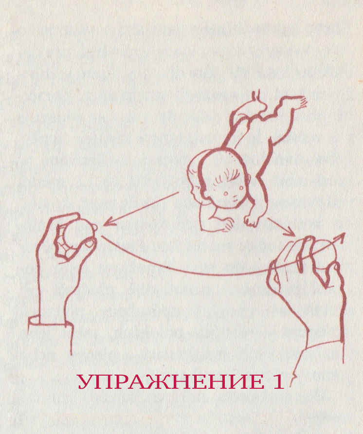 Цель воспитания: ребёнок должен уметь поворачивать голову во все стороны и во всех положения, прежде всего поднимать голову вверх в положении на животе и притягивать подбородок к груди в положении на спине. 1.Упражнение. В положении лежа на животе следить за движущимися на высоте предметами. Положим ребёнка на живот, лучше на край стола, чтобы голова слегка выступала за пределы стола. Покажем ребёнку интересующий его предмет, который перемещаем от земли (ребёнок при этом склоняет голову) вверх, чтобы при наблюдении за предметом ребёнок задирал голову. Упражнение усложняем тем, что перемещаем предмет на вверху направо и налево, чтобы ребёнок поворачивал поднятую вверх голову. 2.Упражнение. Поднятие головы в положении лежа на спине. Положим ребёнка на спину, подадим ему пальцы, и когда он ухватиться за них обеими руками, слегка потянем; ребёнок приподнимет голову, притянет подбородок к груди и одновременно сожмёт руки. Можно также показать ребёнку интересный предмет и перемещать его к но