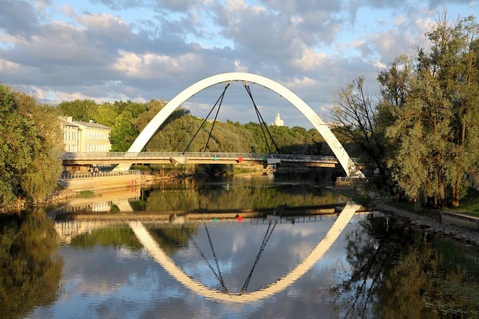 Мост Свободы в створе улицы Лай - самый студенческий мост Тарту. По нему легко добежать от учебного корпуса «Дельта-центр» до главного здания университета. Ранее эта переправа через реку Эмайыги была пешеходной, но в 2009 году петербургские инженеры возвели здесь автодорожный мост необычной конструкции. Мост в целом - это комбинированная система, состоящая из металлической бесшарнирной арки, к которой на четырех вантах подвешено пролетное строение из предварительно напряженного железобетона. В боковых стенах арки устроены отверстия для декоративной подсветки для создания эффекта радуги. Металлоконструкции арок были изготовлены в России, работы по устройству свай для фундаментов выполняла шведско-эстонская фирма, ванты поставлялись из Австрии. Главный инженер проекта - наш эксперт по мостам, генеральный директор группы компаний «Стройкомплекс-5» Станислав Александрович Шульман.