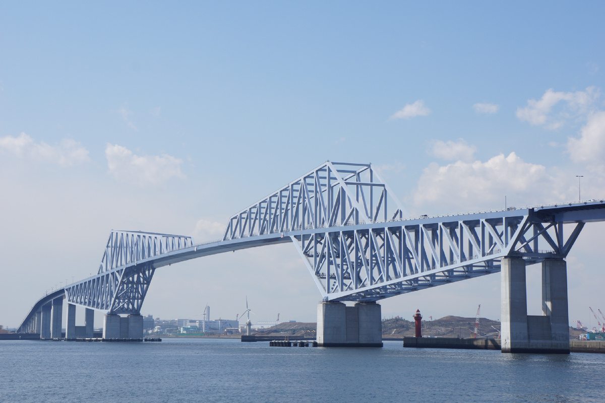 Официальное название этого моста - "Ворота в Токио". Но чаще его называют "Мостом Двух динозавров" - кажется, что динозавры смотрят друг на друга. Интересный внешний вид моста – результат сложного архитектурного решения. Дело в том, что рядом с мостом расположен аэропорт Ханэда, и согласно авиационному законодательству высота моста не должна было превышать 98,1 метр. Данное ограничение не позволяло установить высокие опорные столбы моста. С другой стороны, под мостом должны проходить грузовые суда, поэтому центральный пролет должен был быть не менее 54,6 метров высотой. В конечном счете было решено использовать особую ферменную конструкцию консольного типа, которая позволяла усилить прочность моста и равномерно распределить нагрузку на опорные столбы. Характеристики сооружения впечатляют: общая длина моста – 2,618 метров, высота от водной поверхности в самой верхней точке – 87,8 метров, отрезок, проходящий непосредственно над водой – 1,618 метров. По мосту проходит четырхполосная автот
