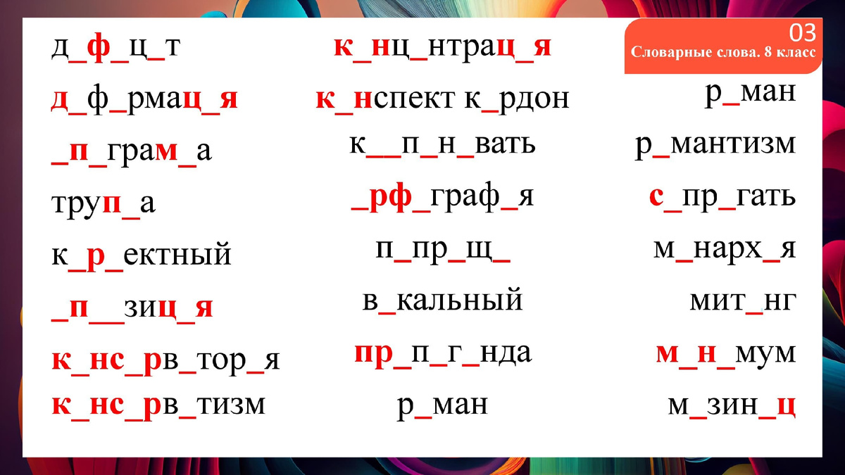 Словарные слова с пропущенными орфограммами. 8 класс. Задание 1 ВПР_2025. Список словарных слов, слов -исключений, сложных для написания