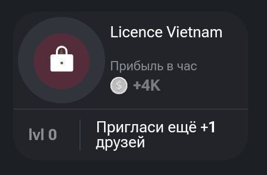 Сегодня в разделе "Legal" появилась ещё одна новая карточка под названием "Licence Vietnam".О новой карте:Прибыль: 4000 в час👉 Примечание: У карты есть время восстановления! Для её открытия необходимо пригласить одного человека.