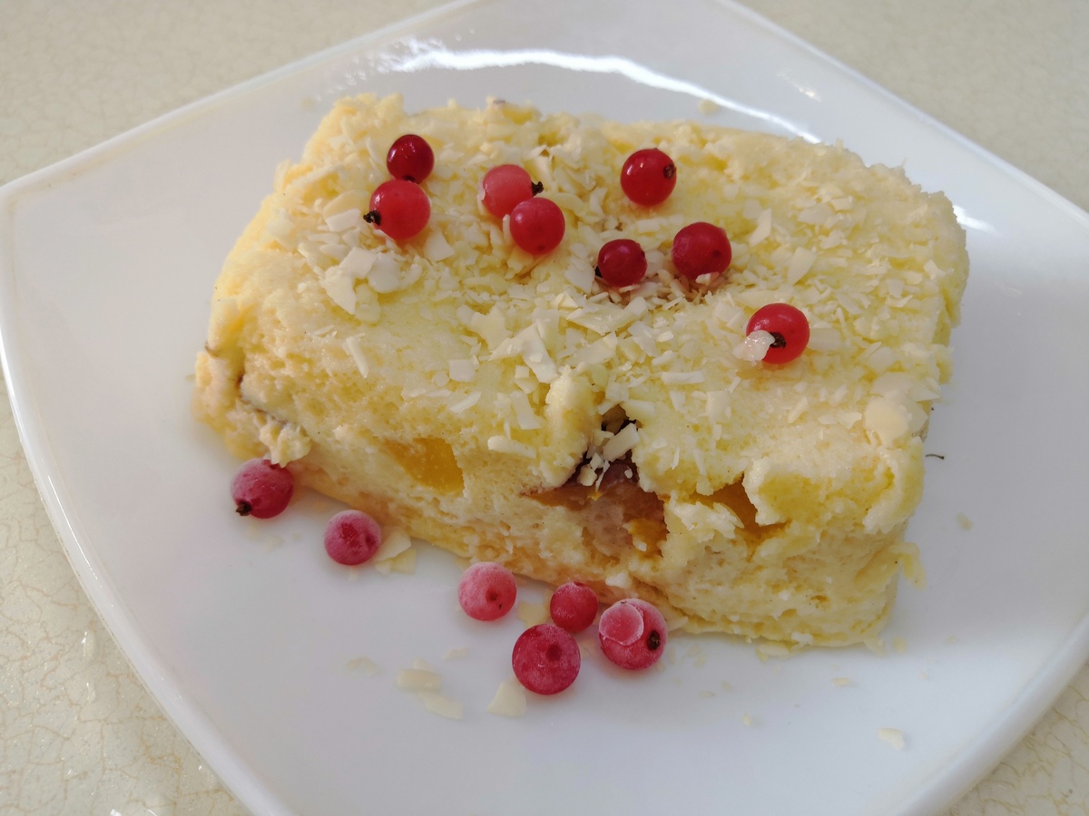 Добавила ароматный персик и получился легкий и быстрый ПП кекс