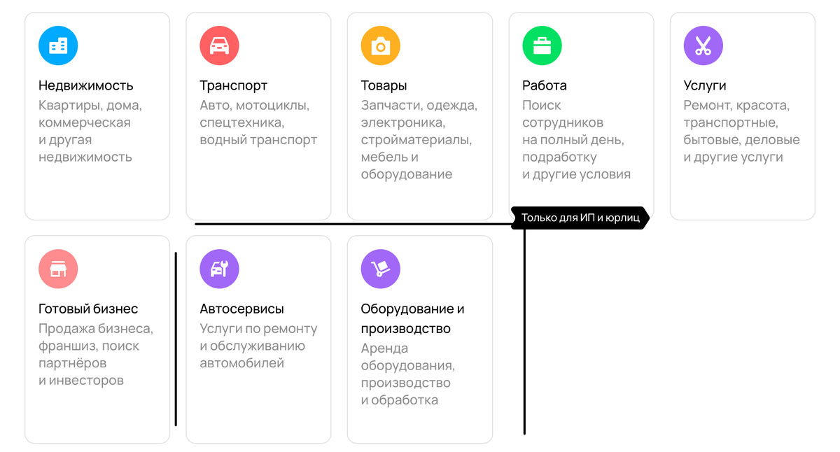 В конце того года Авито добавил в вертикали новый раздел «Готовый бизнес», а сейчас появились еще «Автосервисы», «Оборудование и производство» В разделе «Автосервисы» и «Готовый бизнес» интересный тариф — с оплатой за звонки и чаты. 490 ₽ за каждый целевой звонок или чат в категории «Готовый бизнес» и от 45₽ в разделе «Автосервис» зависит от региона и типа услуг. Размещения бесплатные. Деньги будут списываться только за звонки и чаты.