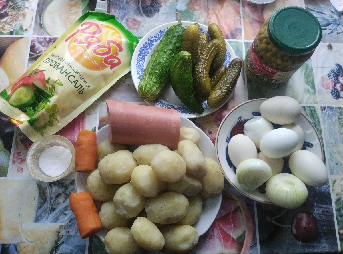 Картофель отварной: 1200 гр. Лук: 130 гр. Свежий огурец: 330 гр. Солёный огурец: 320 гр. Колбаса варёная: 410 гр. Яйцо: 7 шт. Горошек консервированный: 1 банка 700 гр. Соль, майонез по вкусу. Картофель и огурцы нарезаем на мелкий кубик. Лук и морковь нарезаем также на мелкий кубик. Колбасу и яйца нарезаем мелким кубиком. Теперь возьмите глубокую миску. Добавьте к нарезанному картофелю нарезанные огурцы. Добавим к картофелю и огурцам нарезанные лук и морковь. К картофелю, огурцам, луку и моркови добавим мелко нарезанные яйца и колбасу. Аккуратно перемешайте и добавьте зелёный горошек, затем снова перемешайте и посолите по вкусу.