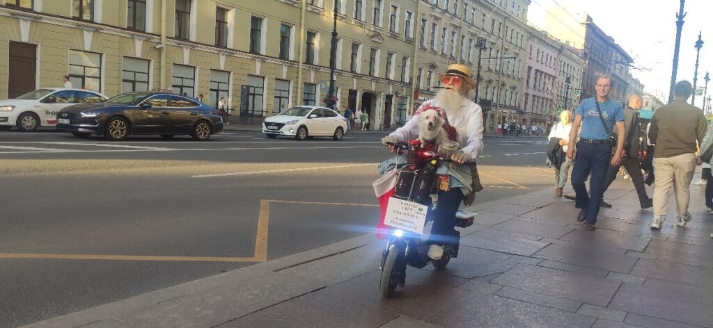 По тротуару главной улицы Санкт-Петербурга Невского проспекта рассекал на мотороллере бородатый дядька с милой собачкой. Пёсик изящно подвывал под звучавшую из динамика на мотороллере песню «Ленинградское время – ноль часов, ноль минут» – легендарную композицию российского бит-квартета “Секрет”. А дядька ехал на мотороллере средь множества людей – Невский всегда запружен – и с надеждой ожидал от прохожих донаты. В ответ на заряд прекрасного настроения, который он дарил всем окружающим. Люди улыбались, снимали импозантного дядьку-деда на смартфоны. И даже стоявший у комнаты страха злой клоун, завлекавший туда посетителей, не смог скрыть своего истинного настроения. Он был жутко удивлен, хотя и явно многое видел. Смотрите наше позитивное видео. Фгто и видео “Брянского Ворчуна”