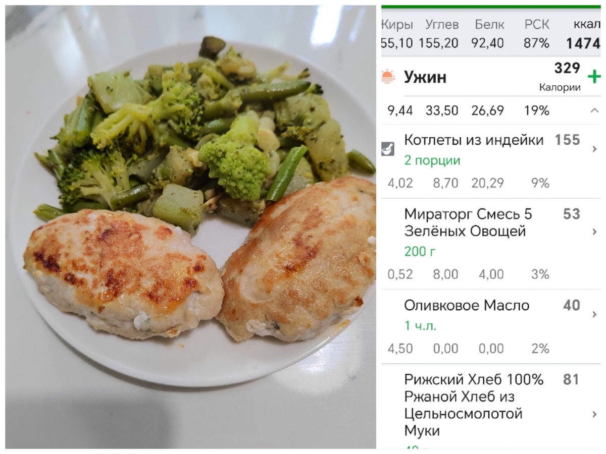 Сегодня на ужин котлеты из индейки и кабачка, каждая по 65 гр, смесь 5 зелёных овощей 200 гр, кусочек ржаного хлеба 40 гр(🤔).