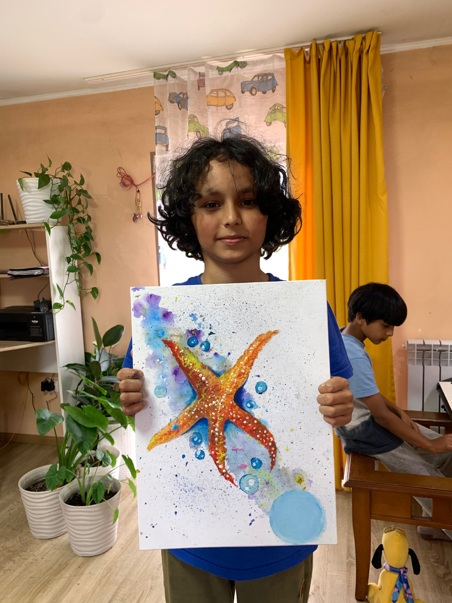 Старший любит рисовать. Ну не так, что бы ему ничего не надо, а только холст и краски, нет. Но если забрать телефон, то он спокойно сядет за свой письменный стол и начнёт ваять. Последние пол года он много рисует гелевой ручкой по мотивам аниме, но раз в неделю он ходит на групповые занятия по рисованию и там он рисует красками, шаг за шагом, как показывает педагог. По сути он копирует, но это все равно прекрасно. И вот неделю назад он принес это произведение искусства. Я влюбилась в эту морскую звезду! Она как будто живая, такая объемная. Но ребёнок захотел ее продать через мой инстаграм методом аукциона. В итоге мы решили начать с 1000 рублей и за час цена выросла до 2000 😎 Ребенок прыгает от радости до потолка. Кричит: «давай, бери деньги, высылай им номер карточки » 😂 Я отвечаю, что надо подождать хотя бы сутки, а он уже загорелся ))) Я говорю: «Ты не забыл, что моя комиссия 50%? (У нас был такой уговор, что если он использует меня, то моя комиссия будет столько-то, а е