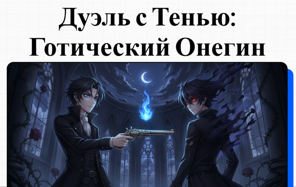 Таким образом, если канонический роман концентрируется на трагедии «лишнего человека» в светском обществе, то «Дуэль с тенью» фокусируется на внутренней психологической драме Онегина, который, будучи «Готичным подростком-интровертом», вынужден буквально сражаться со своим ожившим внутренним идеалом, чтобы выжить.