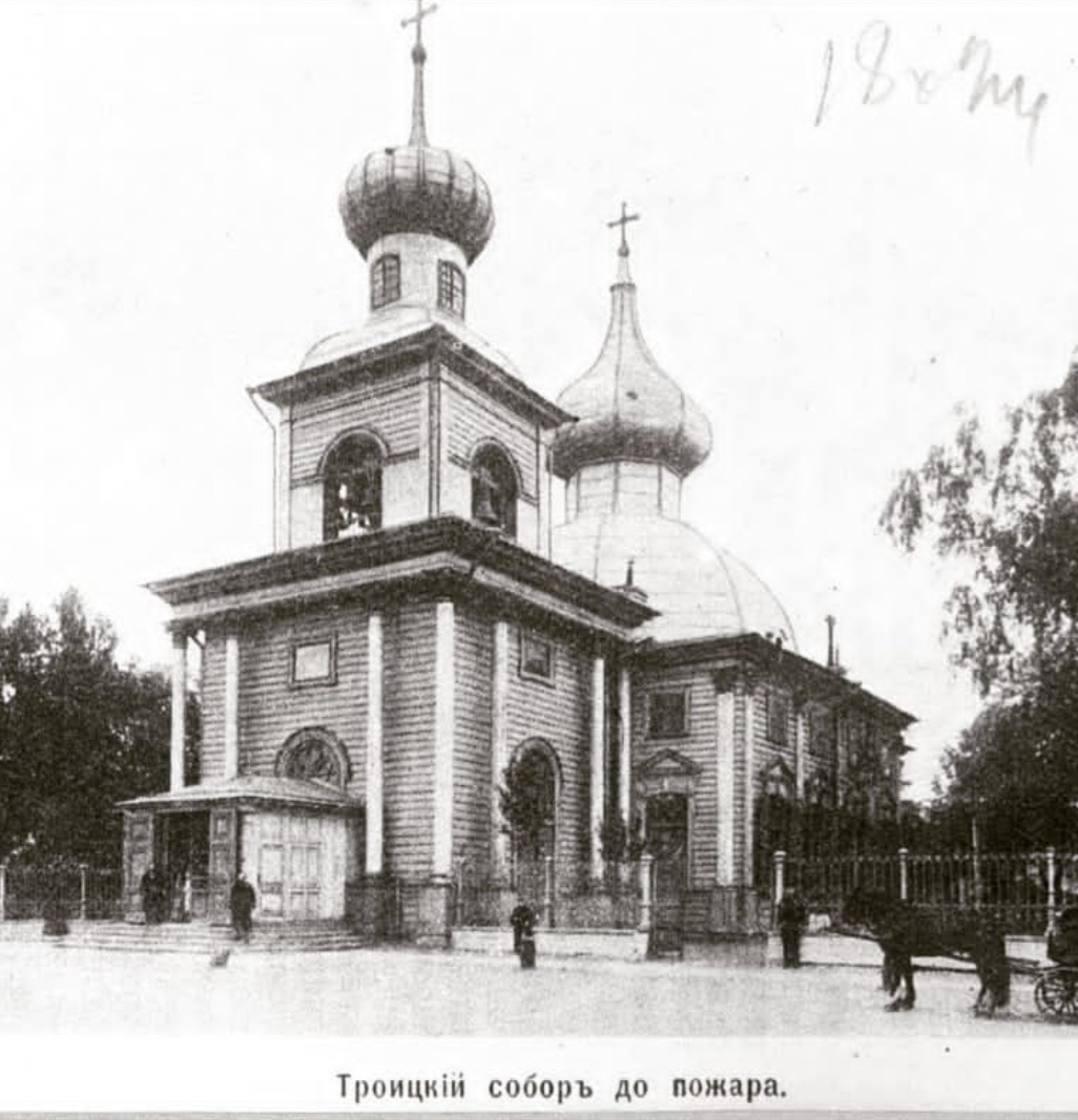 В год трехсотлетия Дома Романовых столица Российской империи лишилась одного из первых храмов города,связанного с именами Петра Великого и его наследницы Елизаветы Петровны. В ночь на 7-е (20-е по новому стилю) февраля 1913 года, в 3 часа 40 минут Петровская пожарная часть (ныне 1 ПЧ 5 ОФПС) выехала на тушение пожара в деревянном соборе во имя Святой Живоначальной Троицы. Вбежав в храм, брандмейстер (начальник пожарной части) отодвинул одну из икон на иконостасе и увидел, что стена под ней охвачена пламенем до самого потолка. Огнеборцы и священнослужители поспешили спасать церковные реликвии. Дьякон Лев Наговский собственноручно вынес раку с частицами мощей. И в связи большой опасностью скорого уничтожения храма огнем разрешил пожарным вынести Престол, даже касаться которого по правилам церкви мирянам запрещено. Пожарные также вынесли из храма запрестольную “сень”, вышитую золотом самой императрицей Елизаветой,дочерью Петра Великого. Вынесли и старинное паникадило "о семи рожк