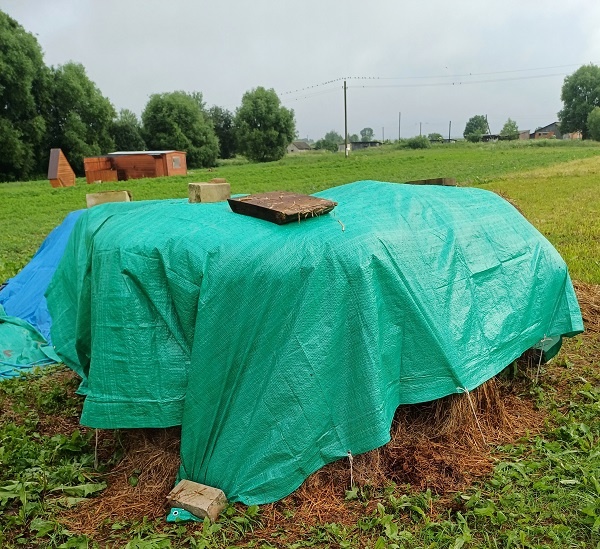 Кто со мной не знаком - с мая 2020 года живем с мужем в деревне МО (северо-запад). Мы предпенсы (мне 57, мужу 60 лет). Участок купили в 1998 году, дому уже 24 года. Все удобства в доме, живем лучше, чем в квартире. Мы не зависим от желания ЖКХ отключить или включить гвс, отопление. Вообщем, ляпота. Но сейчас о не об этом, а о том, что успела сделать с 11 июня, ну кроме того, что сгоняла в Москву к маме на 2 дня и порешала много проблем, а вчера весь день спала (это я так реагирую на нервозность во время поездок в Москву). Итак, купила 4 тюка соломы, каждый стоит по 1 000 руб.: Сразу укрыла 3 тюка тентом, который я приобрела в прошлом году в Светофоре. Стоили они (4х4м) три копейки, а требуются везде. Вот и здесь очередной тент пригодился. Я, как настоящий плюшкин, всегда приобретаю товары по выгодным ценам в достаточном количестве. Вот и тогда подсуетилась, купила 5 штук. Крепила тент веревками к земле крючками, купленными на ВБ еще в 2021 году. Пока ездила к маме, ураган, прошедший п