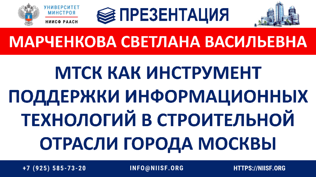 ВСЕРОССИЙСКАЯ ПРАКТИЧЕСКАЯ КОНФЕРЕНЦИЯ. ЦИФРАГРАД – 2024 ИНТЕГРАЦИЯ ЦИФРОВОГО МОДЕЛИРОВАНИЯ В ПЛАНИРОВАНИЕ И РАЗВИТИЕ ГОРОДОВ Инновационная лаборатория. Цифровые решения для градостроительства Университет Минстроя НИИСФ РААСН Модератор: Степанов Вадим Валерьевич - Начальник управления BIM в строительстве АО "Рублево-Архангельское", Ведущий эксперт Университета Минстроя НИИСФ РААСН К выступлению приглашены: «МТСК как инструмент поддержки информационных технологий в строительной отрасли города Москвы» Марченкова Светлана Васильевна - Начальник отдела инновационного развития строительной отрасли Управления научно-технического обеспечения развития строительной отрасли Департамента градостроительной политики г. Москвы, к.э.н. ВИДЕО