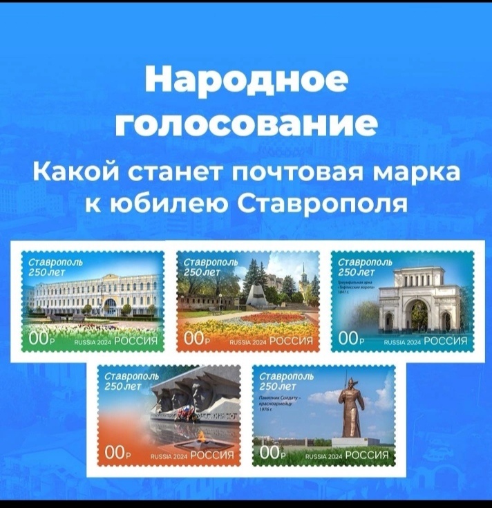 Друзья, в 2027 году город Ставрополь отмечает свой юбилей 250 лет со дня его основания. На странице губернатора Ставропольского края проходит голосование за выбор дизайна почтовых марок, которые будут выпущены по случаю юбилея. Предлагаю Всем принять участие в голосовании. Проходите во ссылке .