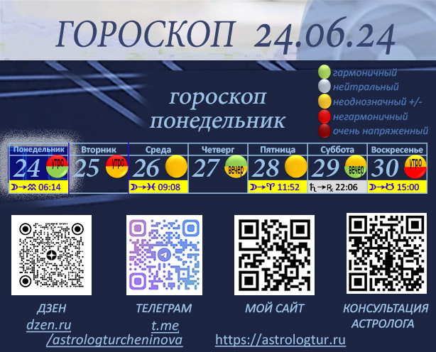 Утро понедельника до 13 часов (мск) - напряженное, Луна соединяется с Плутоном, очень мощный эмоционально напряженный аспект. Подавить эмоции вряд ли получится, но стоит постараться их нейтрализовать, главное найти нейтрализатор, можно попробовать аутотренинг «я спокоен», «всё бренно» и т.п. Такой аспект бывает 1 раз в лунный месяц, и 3 раза – ему подобные -напряженные аспекты, кому интересно пример такого аспекта Моя личная история астролога на напряженном аспекте Луна - Плутон соединение/квадрат/оппозиция Время с 15 часов и до 20 часов (мск) может сложиться очень удачно. Если еще утром о чем-то сильно переживали, то это время может принести облегчение. Могут поступить перспективные предложения, хорошие новости, появиться какая-то идея, произойти что-то новое, что имеет реальный шанс на удачу, успех.