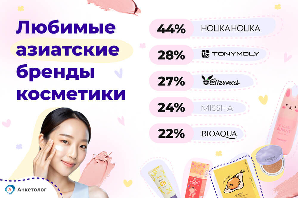 Как часто россиянки приобретают азиатскую косметику, почему отдают ей предпочтение, какие средства и бренды выбирают – узнали в новом исследовании потребительских предпочтений. Треть (32%) россиянок приобретают азиатскую косметику, чаще всего – корейскую (90%). Среди потребительниц 93% согласны с тем, что сейчас существует тренд на азиатскую косметику. В целом 16% респонденток покупают азиатскую косметику примерно раз в месяц и чаще. Более четверти (28%) опрошенных приобретают такие средства раз в два месяца, 31% – раз в три месяца. Еще 22% покупают азиатскую косметику пару раз в год, 3% – раз в год и реже. Если говорить о конкретных средствах азиатской косметики, 74% опрошенных приобретают тканевые маски, 61% – крем для лица, 58% – патчи. Около половины (46%) пользуются сывороткой, 37% – кремом для глаз, тоже 37% – тоником, 35% – мицеллярной водой. Также 27% приобретают азиатские средства с SPF, 23% – бальзамы и гели. Самый известный бренд азиатской косметики в России – Holika Holika: