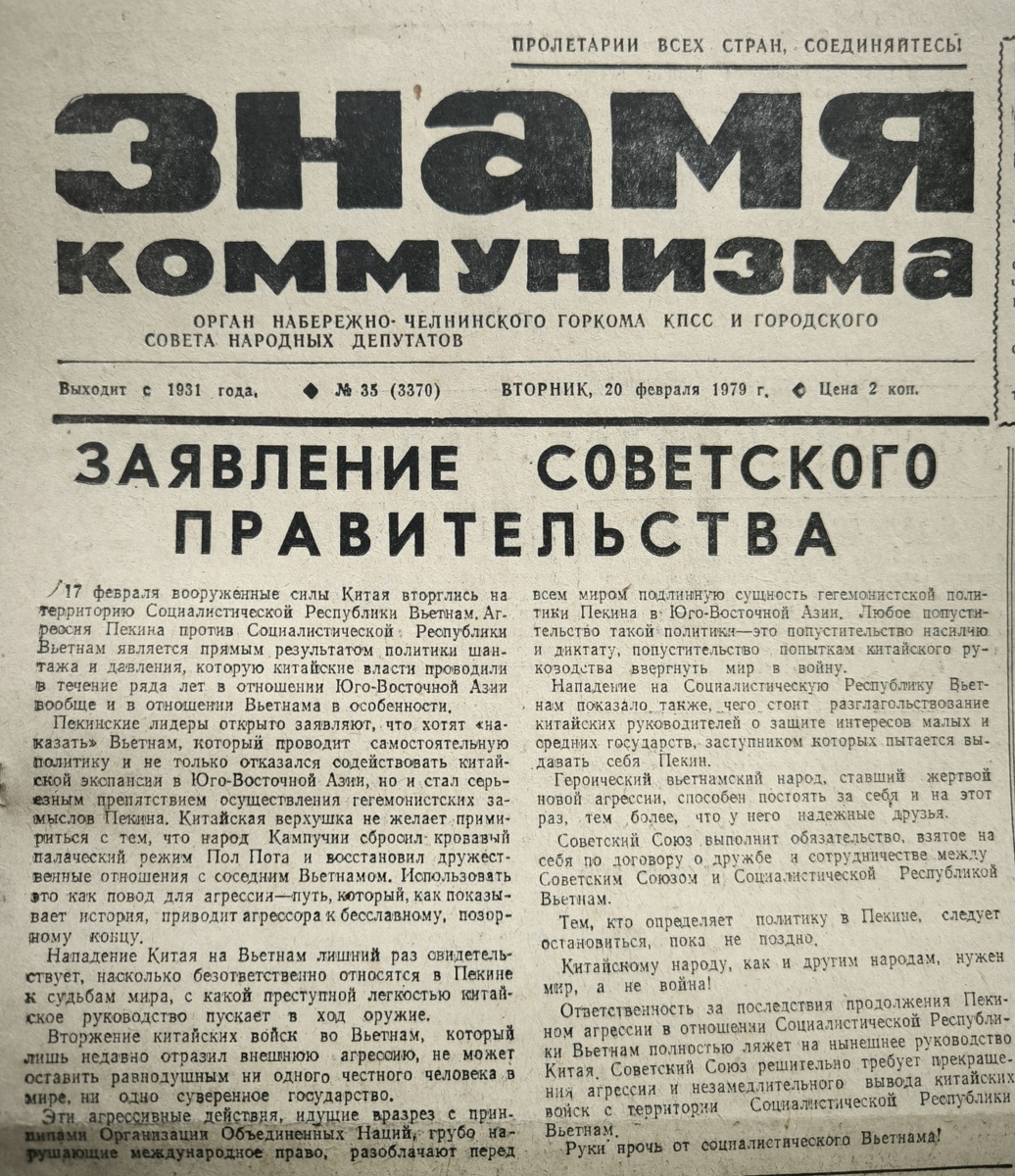 Как известно, в феврале-марте 1979 года произошёл вооруженный конфликт между Китаем и Вьетнамом. Внизу заявление советского правительства, опубликованное в газете «Знамя Коммунизма» от 20 февраля 1979 года. Нападение китайцев на Вьетнам началось 17 февраля 1979 года. Уже 18 февраля на автосборочном заводе состоялся митинг против китайской агрессии. Внизу статья из газеты «Знамя Коммунизма» от 20 февраля 1979 года. (Для справки. В период с октября 1977 по апрель 1995 года автомобильный завод был разделён на автосборочный и агрегатный). Примечательно, что именно в 1979 году КАМАЗ передал в фонд Социалистической Республике Вьетнам не только денежные средства, заработанные на субботнике 21 апреля, но отправил первые партии грузовиков. В первой партии были автомобили КАМАЗ-5511, а во второй – автомобили КАМАЗ-5320. Внизу заметка из газеты «Знамя Коммунизма» от 26 июня 1979 года. Кроме этого, летом 1980 года группа вьетнамцев проходила производственную практику на КАМАЗе. Внизу благодарность