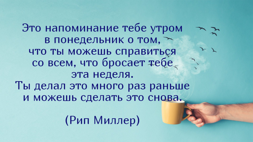 1. Это напоминание тебе утром в понедельник о том, что ты можешь справиться со всем, что бросает тебе эта неделя. Ты делал это много раз раньше и можешь сделать это снова. (Рип Миллер)
