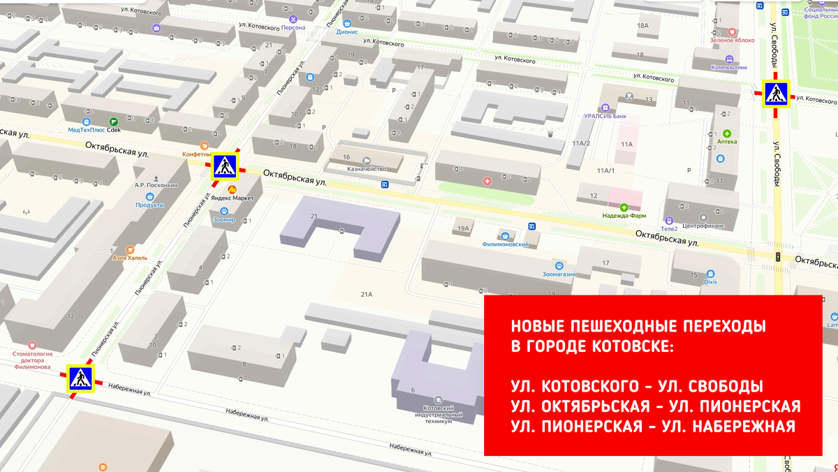 Новые пешеходные переходы будут обустроены на трех перекрестках улиц: Котовского и Свободы, Октябрьская и Пионерская, Пионерская и Набережная до конца текущей недели.